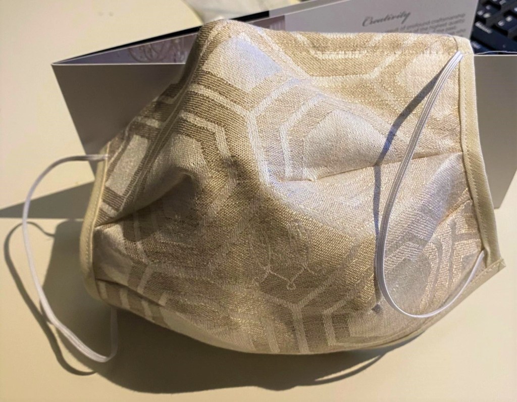Nella speciale occasione della prima presentazione (ne seguiranno altre), l’Atelier Martina Vidal, presente al Florian con Marta e Sergio, ha consegnato ai partecipanti un omaggio esclusivo. Si tratta della mascherina che vedete nell’immagine con filtro chirurgico e ferretto appoggia naso, arricchita da prezioso tessuto buranello. L’idea di Marta esprime un motivo a rombi della linea Architettura Venezia pensata da Sergio che si è ispirato al pavimento dell’isola di San Giorgio.