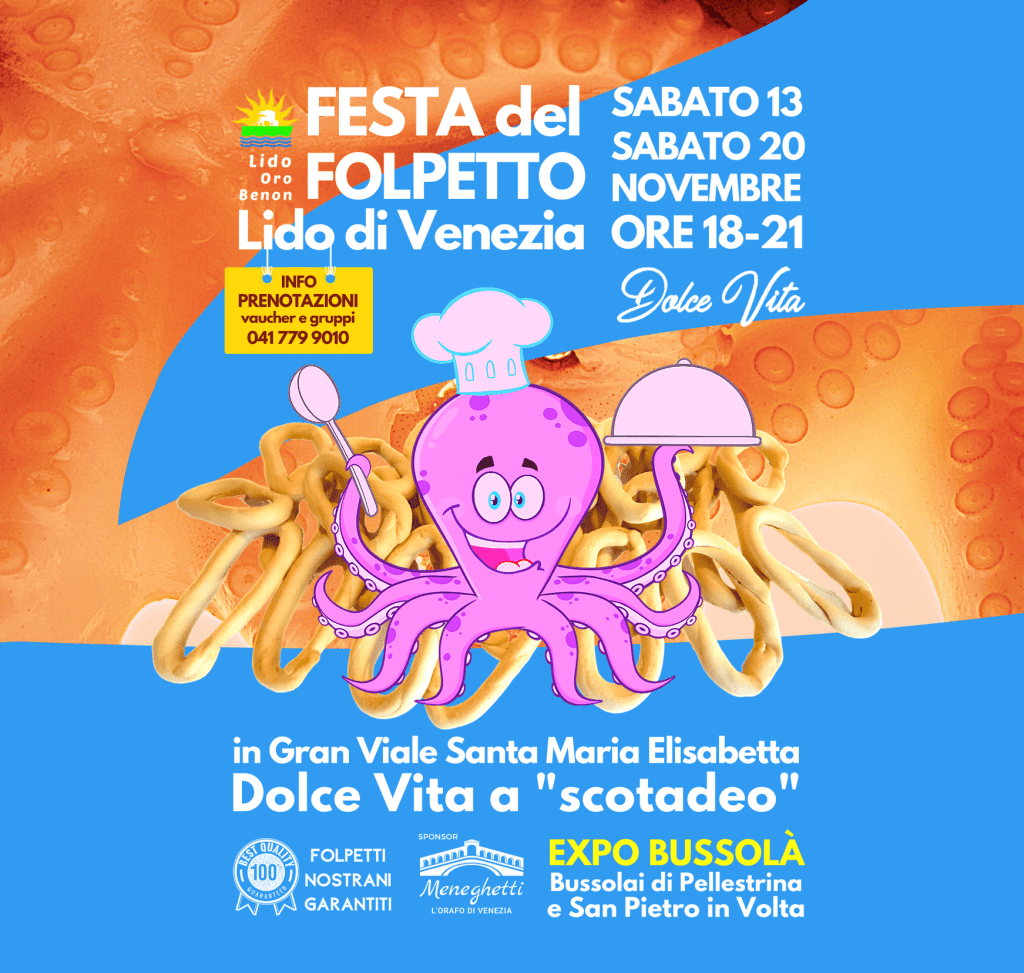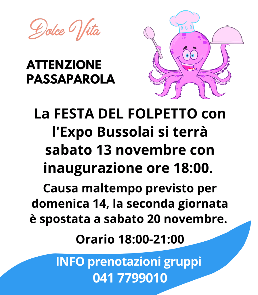FESTA DEL FOLPETTO & EXPO BUSSOLÀ sabato 13/11 al Dolce Vita. La seconda giornata di festa prevista per domenica 14, a causa del maltempo, la spostiamo a sabato 20/11. Orario 18:00-21:00. INFO prenotazioni gruppi 041 7799010