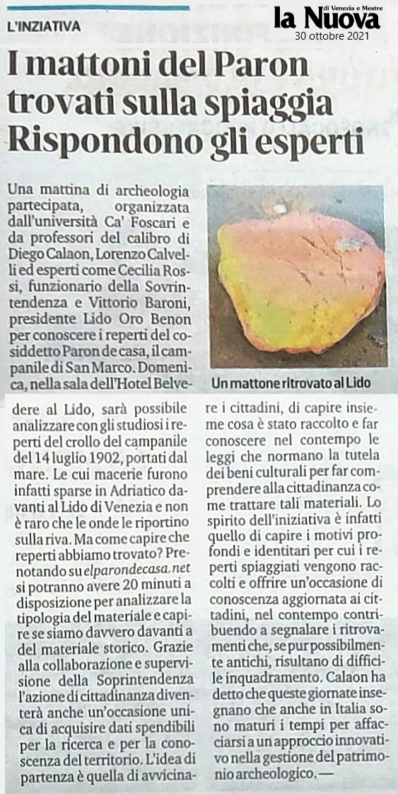 DOMENICA 7 NOVEMBRE, ANALISI REPERTI RITROVATI IN SPIAGGIA DAI CITTADINI. EVENTO ALL’HOTEL BELVEDERE, LIDO DI VENEZIA. PROGETTO EL PARON DE CASA, CAMPANILE DI SAN MARCO