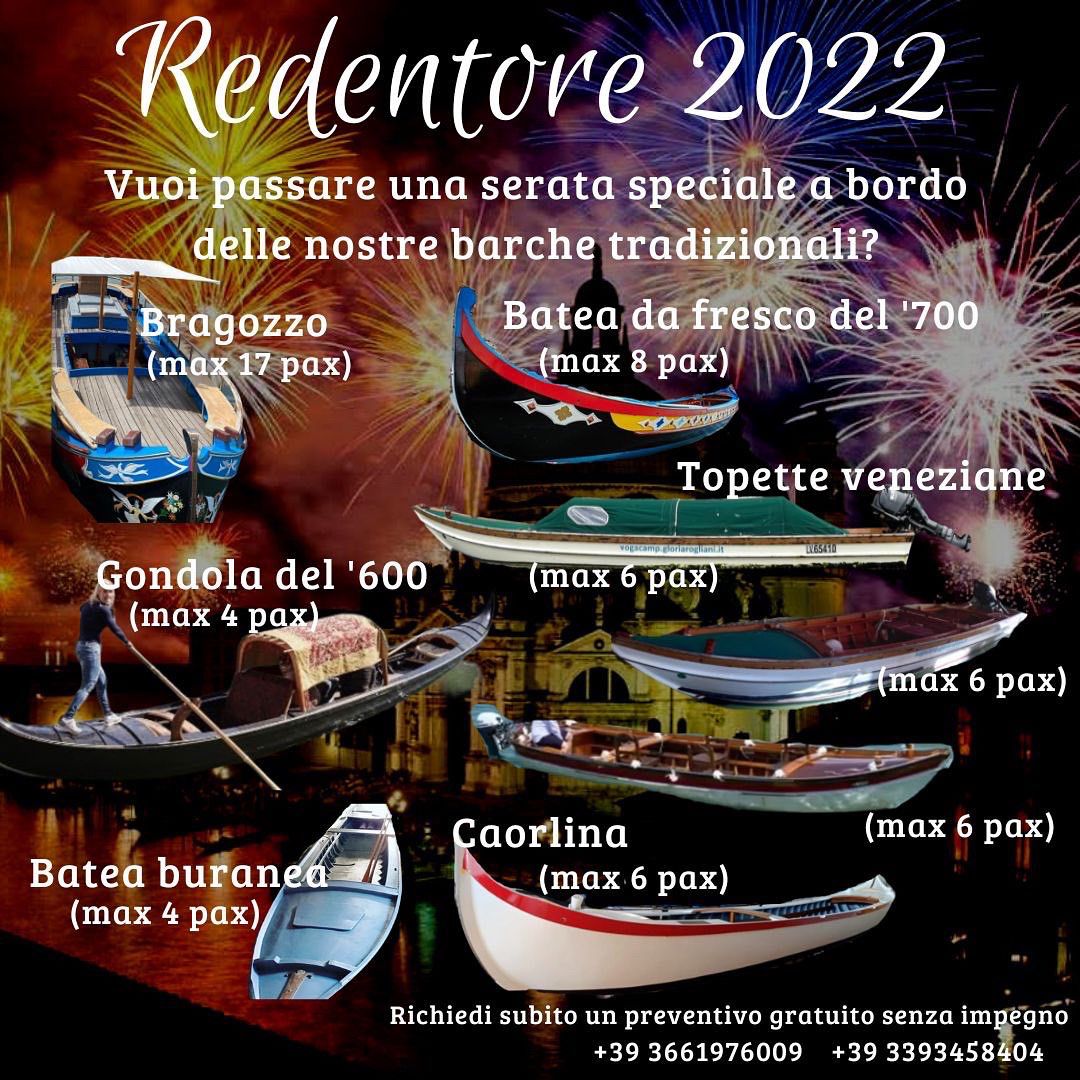 La tradizione del Redentore risale al 1577 e ricorda la fine di una terribile pestilenza, festeggiata con l’edificazione dell’omonima basilica del Palladio sull’isola della Giudecca, alla quale ci si può oggi recare in pellegrinaggio attraversando un imponente ponte di barche lungo 330 metri. Le celebrazioni includono quindi la funzione solenne presieduta dal Patriarca e la processione religiosa, mentre il week-end si conclude con la Regata su gondole, all’interno della Stagione Remiera di Voga alla Veneta (fonte: Venezia Unica)