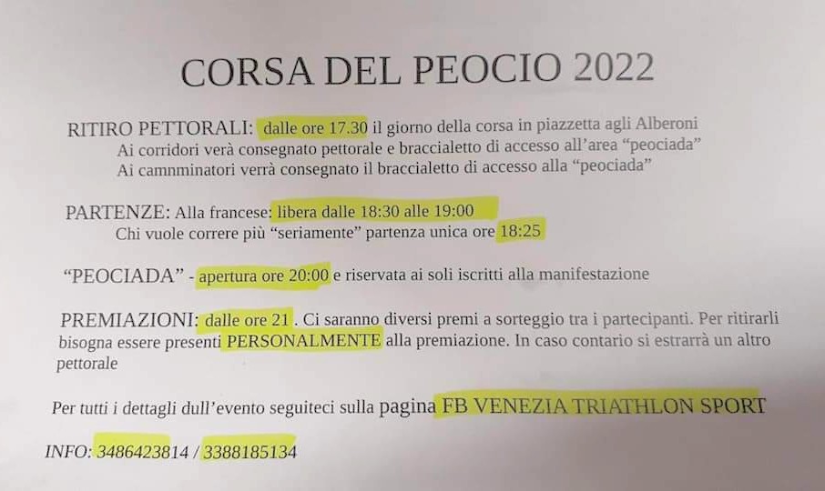 Percorso della Corsa del Peocio in programma il 20 agosto 2022, evento organizzato dall’Associazione Alberoni Lido di Venezia: