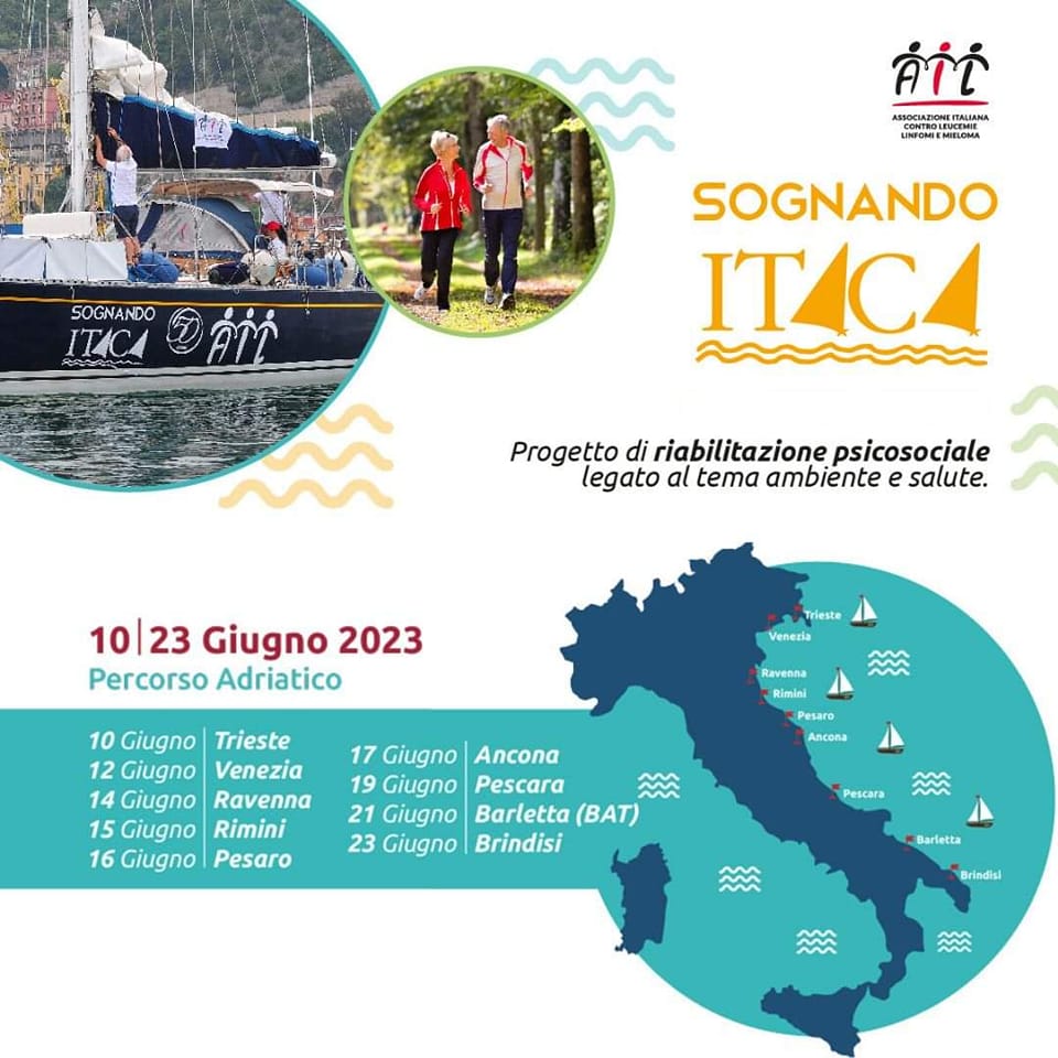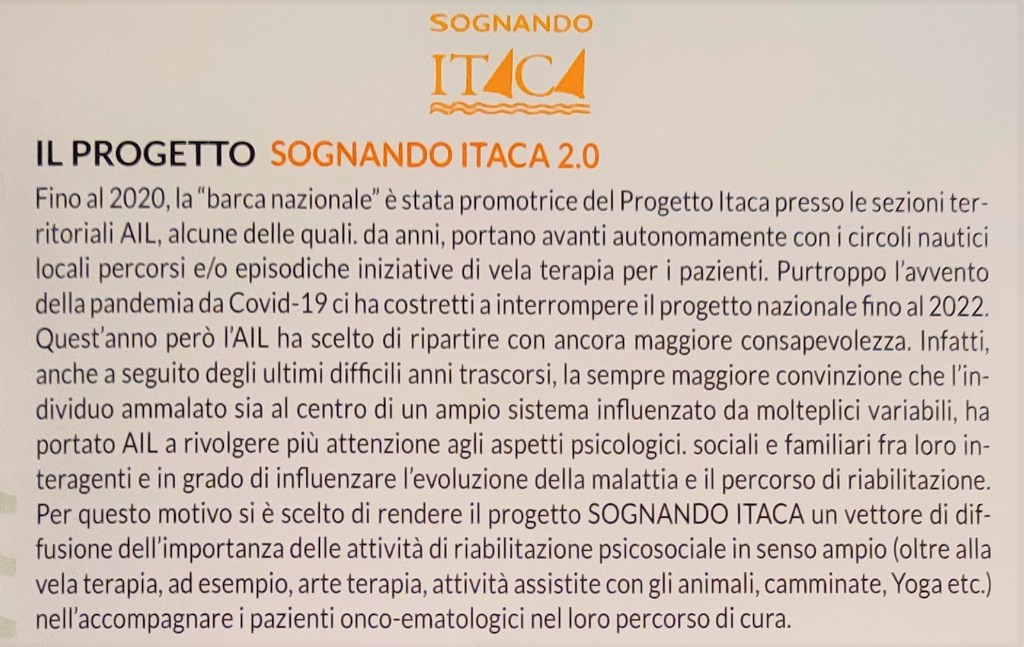 L’innovativo progetto (LINK PER SEGUIRE TUTTO IL VIAGGIO) propone attività di velaterapia, arteterapia, musicoterapia, ginnastica dolce e altro ancora. I pazienti onco-ematologici si trovano, come Ulisse, ad affrontare un mare aperto, sconosciuto e pieno di insidie. Grazie all’esperienza di “Sognando Itaca” scoprono nuovi territori, relazioni, solidarietà e risorse che li aiutano ad affrontare meglio il percorso della malattia e a migliorare la loro qualità di vita.