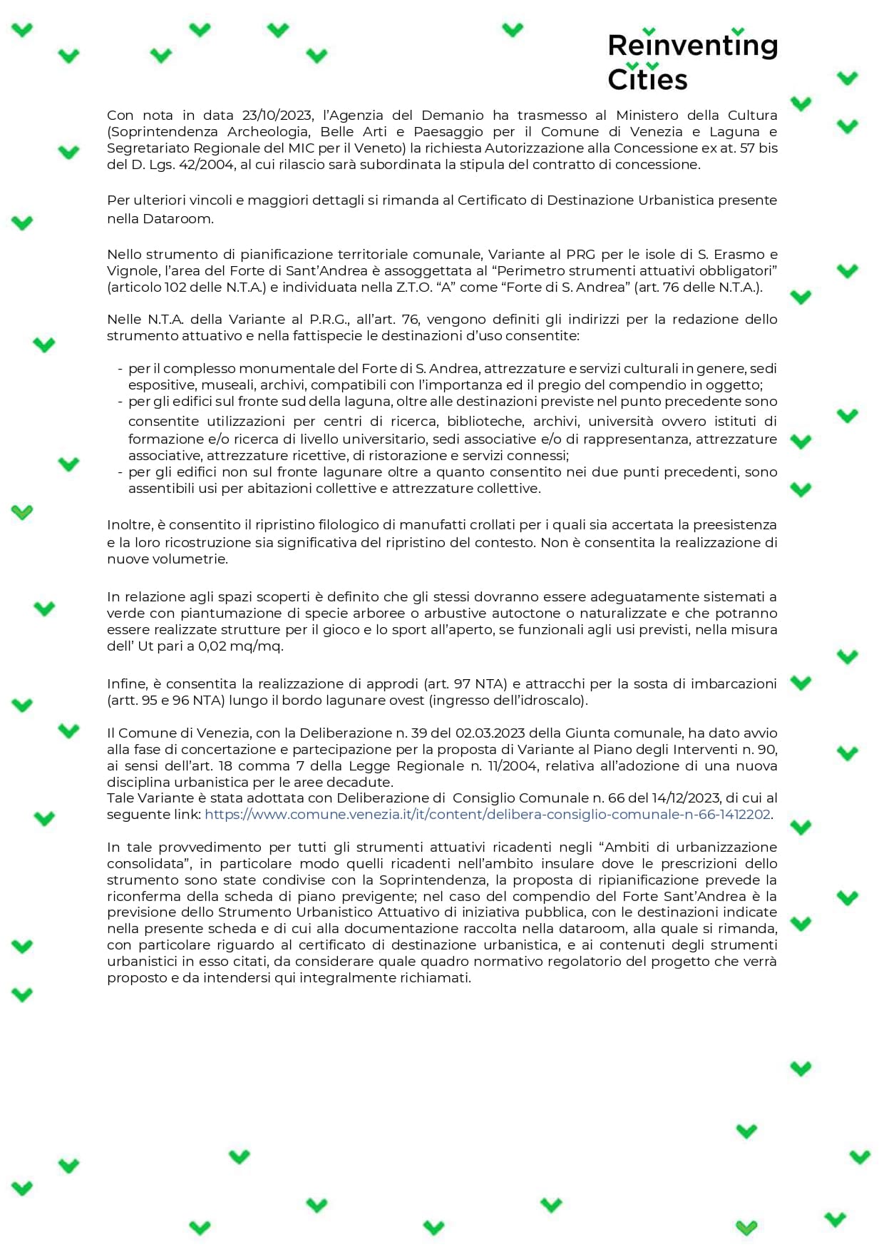 Questa imponente fortezza si estende su un’area di circa 25 ettari, composta da una torre centrale, strutture accessorie e circa trecento metri di mura di cinta, intervallate da quaranta cannoniere poste in riva all’acqua e da una seconda batteria posta sui terrazzamenti. Il recupero e la valorizzazione del complesso dell’ex Fortezza di Sant’Andrea deve tenere conto del contesto circostante, come la destinazione funzionale del sito, le modalità di gestione e le strategie di riqualificazione delle isole vicine e, nonché l’unicità e la fragilità del territorio l’ecosistema lagunare. La valorizzazione della Fortezza dovrà essere perseguita attraverso la progettazione e l’ideazione di un modello di sviluppo che integri elementi ambientali, sociali ed economici.