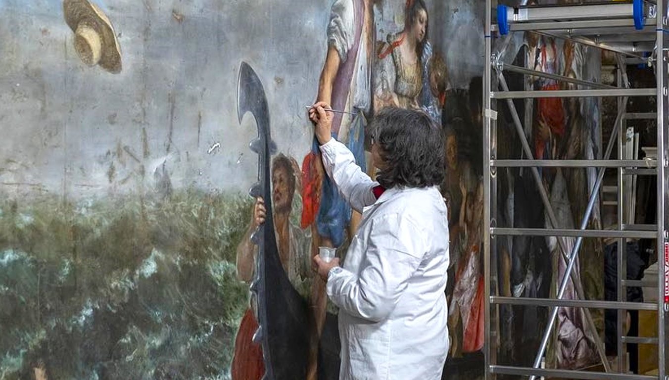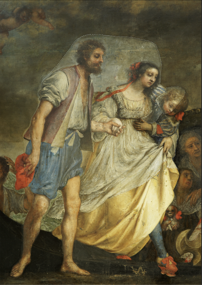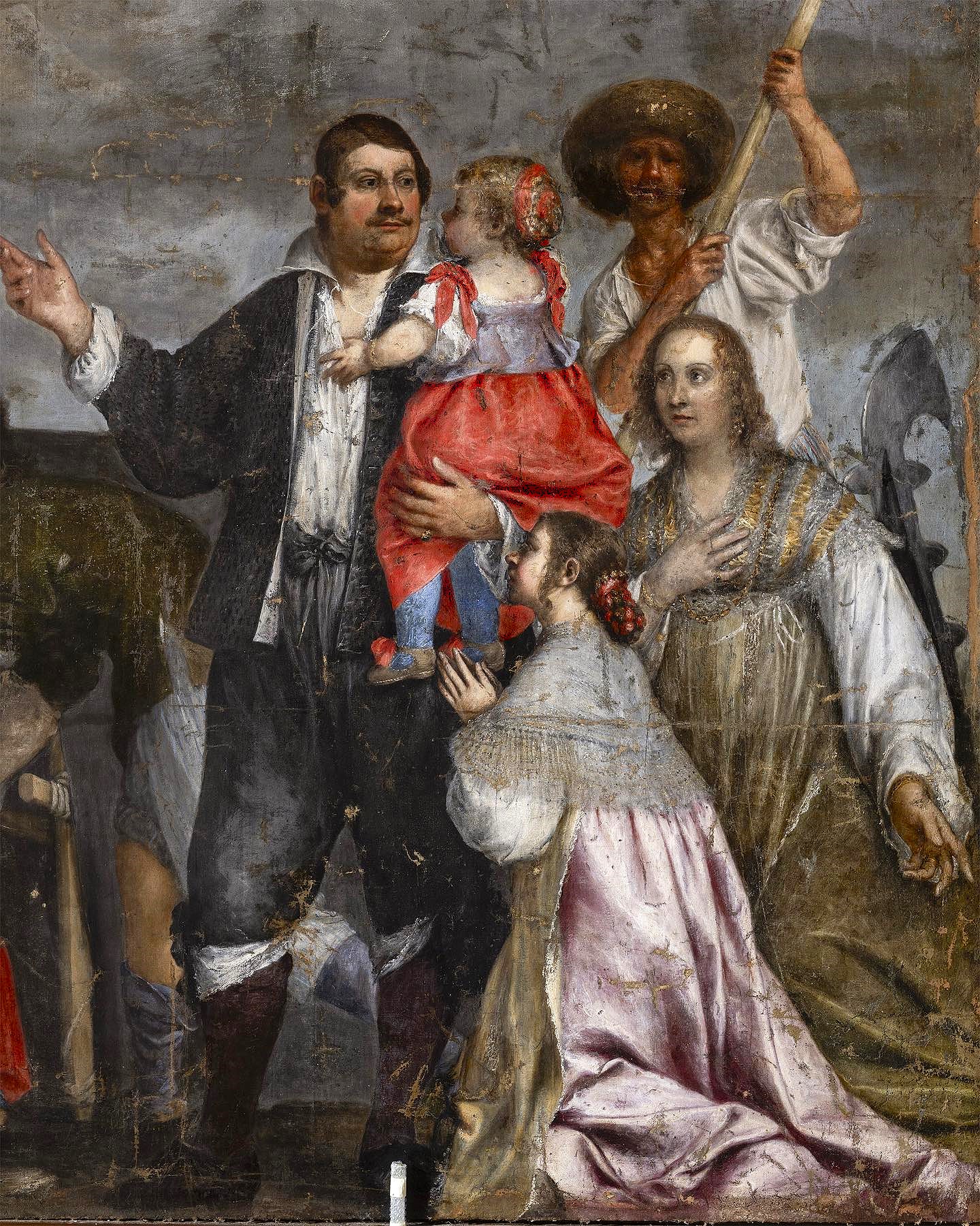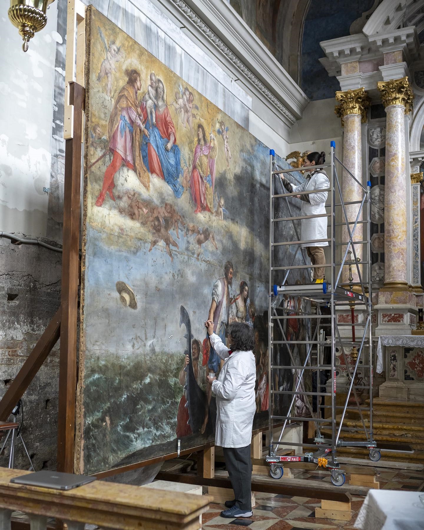 Le conservatrici Enrica Colombini e Sofia Marchesin hanno rimosso secoli di sporcizia superficiale e vernice ossidata, rivelando la vibrante tavolozza di colori dell’artista. Questa scena toccante è stata commissionata da Zuane (Giovanni) Ventura come ex voto, segno di gratitudine per la sopravvivenza della sua famiglia a un naufragio in gondola nel 1610.